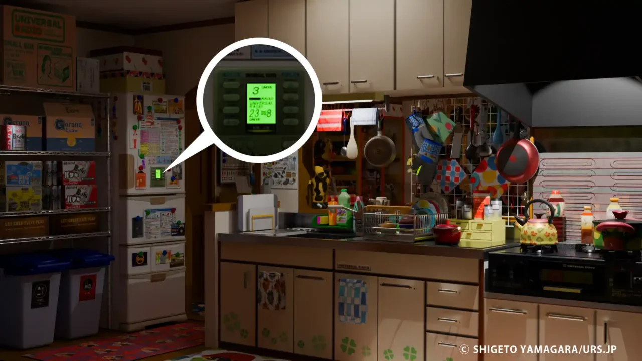 同じ画角の夜シーン。当時使っていた冷蔵庫の扉部分に液晶パネルがついており、ほんのり発光していたので、その液晶文字やバックライトを再現してます。…本編でこのパネルがクローズアップされる予定はないですが、厨二心をくすぐるギミックを搭載した冷蔵庫だったので、思い出深く再現しました。ヘンテコ家電だよね。