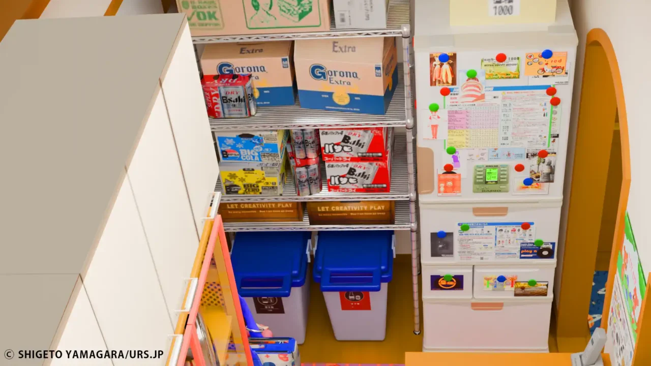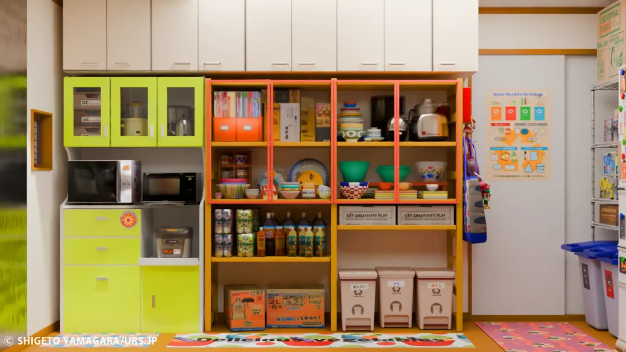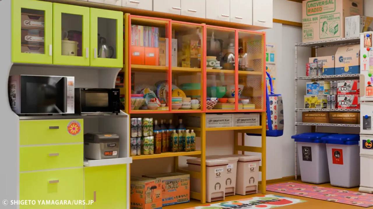 画像左のライトグリーンの食器棚は新規作りおこし。そういえば、当時のキッチン奥には炊飯器やや収納する引き出し式の食器棚があったのを思い出しました。実物とはデザインや仕様が異なるデザインですが、『ちぃボク』のキッチンとの調和性を考慮してこのオリジナルデザインにしました。